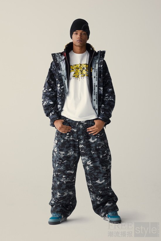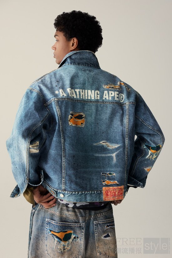 全新艺术迷彩JAPANESE INDIGO ART CAMO融合线条迷彩与靛蓝色调,辅以匠心细节,创造出传统与现代交汇的独特图案。系列中的和风牛仔单品彰显精湛工艺,横须贺夹克则巧妙结合经典纹样与当代廓形。这些设计不仅是服饰,更是文化宣言,呼应着千禧年初奠定BAPE®传奇地位的艺术精神。