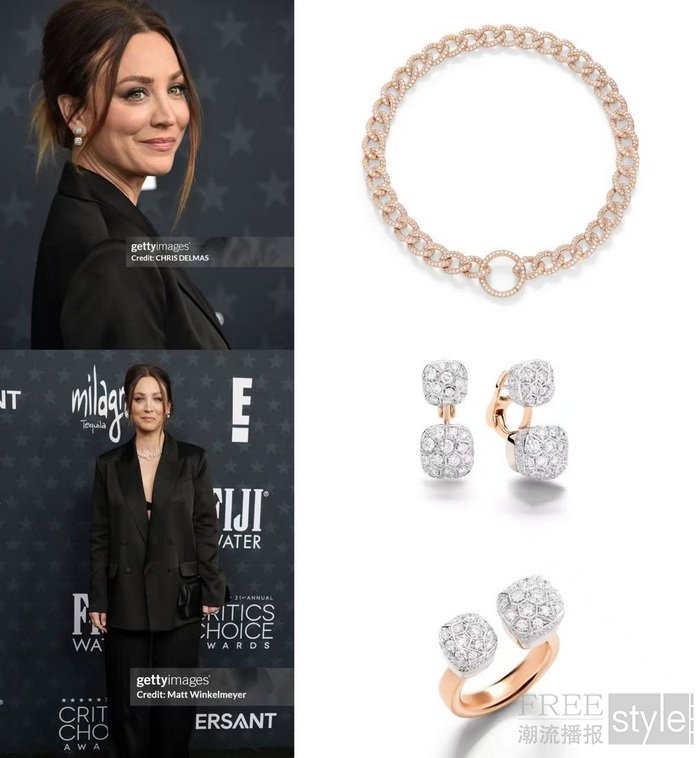 美国知名女演员凯莉・库柯(Kaley Cuoco)佩戴Pomellato宝曼兰朵珠宝,亮相第 31 届评论家选择奖颁奖典礼。颈间项链熠熠生辉,以夺目光芒衬显优雅气度。
