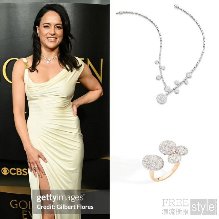 美国知名女演员米歇尔・罗德里格兹(Michelle Rodriguez)选择Pomellato宝曼兰朵珠宝,亮相金球奖荣耀之夜活动。非对称造型搭配晶莹白钻,闪耀别样个性。