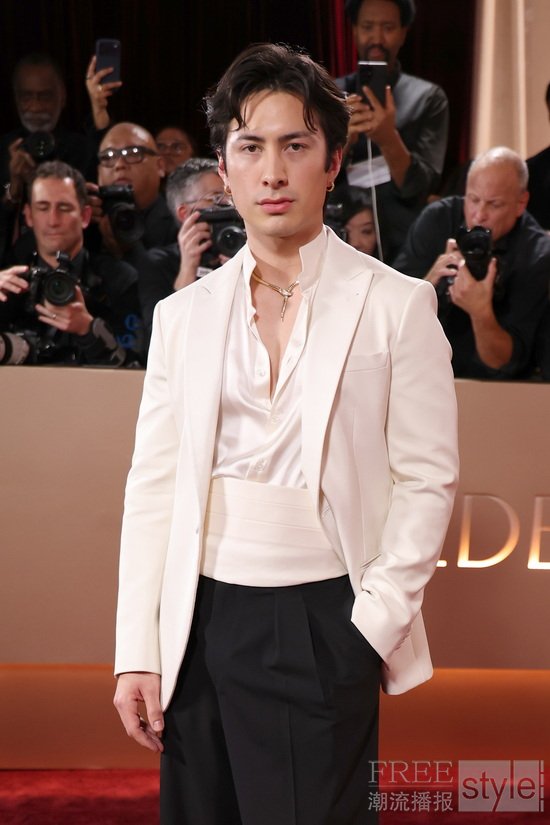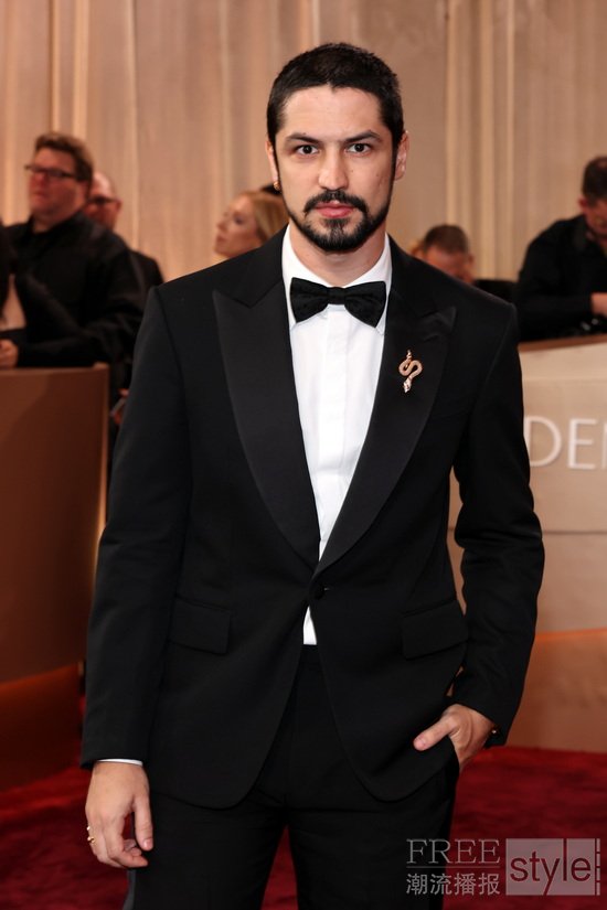 演员奥斯卡·伊萨克佩戴宝格丽 Octo Finissimo 系列腕表出席典礼。腕表以喷砂工艺黄色18K金打造,搭载厚度仅2.23毫米的超薄机芯,诠释意式美学与匠心工艺。胸前高级珠宝系列胸针勾勒沉稳深邃的绅士