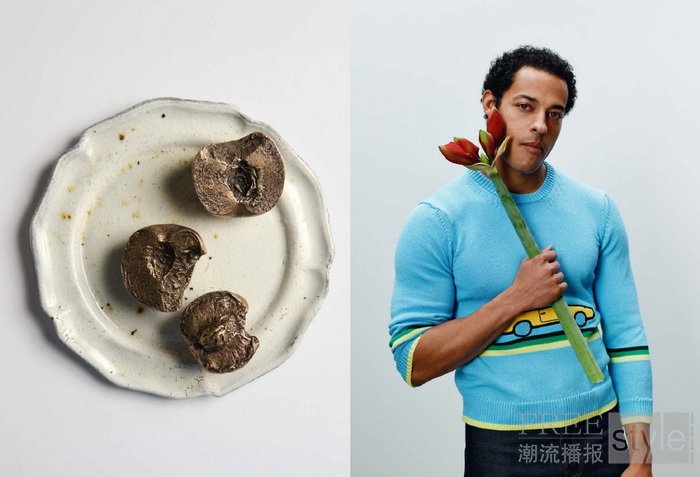艺术作品亦在家居领域被重新演绎:Jonathan Anderson与Luca Guadagnino共同构思的青铜桃形纸镇,由Alice Andrea Ewing 的Pomarius工作室制作;Akiko Hirai手工烧制的陶瓷作品亦陈列于品牌的家居空间。纺织单品则通过Polly Lyster 的 Dyeworks工作室得以实现,其档案中的古董织物被演绎为靠垫、薰衣草香囊、亚麻餐巾与手账本。