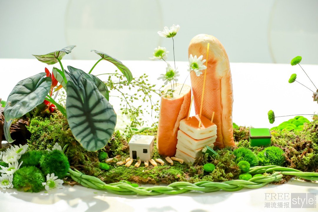 晚宴现场的桌面装置融合了对于“构筑滋养力量”的思考:以植物根系与食物为材料,在桌面上构筑一座流动的、生长的微缩城市,意在回应展览对边界与时间性的探索。这一装置并非一座凝固的纪念碑,而是一处由根系网络、发酵的面团、干涸的果壳与缠绕的藤蔓共同构成的“延迟景观”。