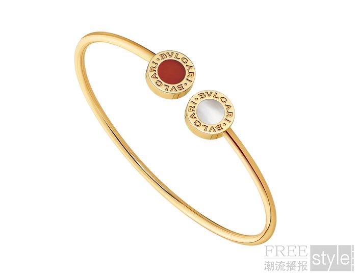 Bvlgari Bvlgari系列中国特定款作为新春甄选佳作,凝萃匠心,绽放节日风华。新作荟萃18K黄金与18K玫瑰金之华彩,缀以红玉髓及珍珠母贝。璀璨流光映耀经典双logo标识,焕发盎然佳节气息。系列产品包含圆形吊坠项链、手镯、可随心搭配的单边耳环以及一款色调柔和的18K玫瑰金手链。手链灵动的翻转式圆盘可于两种宝石间自如切换。