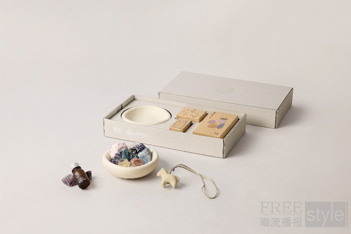 该系列特别推出6款不同主题色的礼盒,其中限定彩色款不仅含有彩色晶石,还配有生肖“小马”的扩香挂件;而常规款则以赤、白、黄、青、兰五种色彩为主,含有例如橘岩石、白体蓝月光、黄东陵等35款天然晶石,多样的色彩代表着不同的能量;此外,还分别配有寓意吉祥的桃花、铜钱、花生、如意、游鱼等扩香挂件,象征更多美好祝愿。