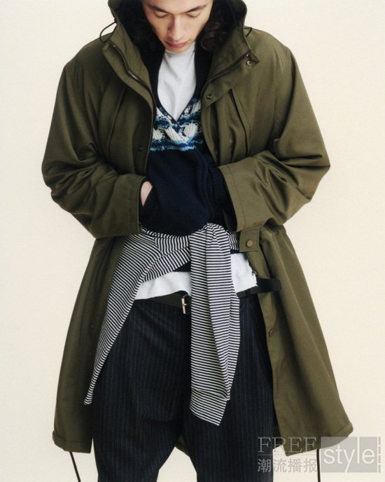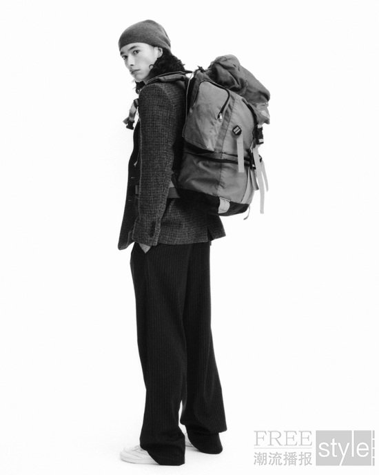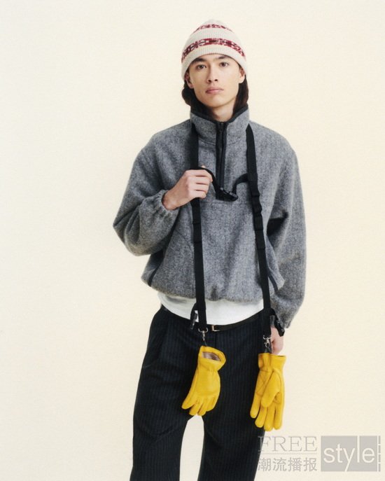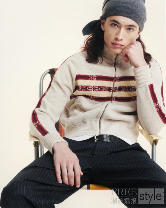 本季作品的廓形亦延展出一段段跨越地域的旅程。卡其色超细防水面料被赋予四种风格,以适应不同气候环境:短款 Clip 防风夹克、长款 Storm 派克大衣、轻量填充的 Alpine 套头夹克,以及廓形饱满的 Bomber 飞行员夹克。Yacht 夹克以高耸衣领与宽大兜帽呼应水上旅途,勾勒出航行语境下的功能美学。Alpine 夹克与针织帽的图案灵感源自中亚地毯的古老韵律,而Half-Zip套头衫则延续徒步者与城市旅人常见抓绒上衣的经典轮廓,并以奢华羊毛材质重新演绎。
