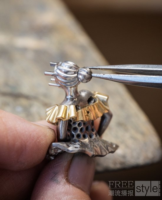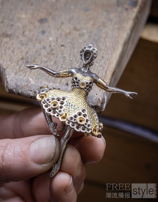镶嵌珍贵或装饰宝石的金质舞裙,在工匠的巧手中跃现,形态与质感栩栩如生。世家的精湛工艺在芭蕾舞伶胸针上发挥得淋漓尽致,以千姿百态的色彩装点舞者,唤起《天鹅湖》(Swan Lake)、《胡桃夹子》(The Nutcracker)、《火鸟》(The Firebird)及《林中仙子》(The Sylph)等经典芭蕾舞剧的绚烂记忆。世家的创意灵感一脉相承,因此其芭蕾舞伶胸针与腕表系列中的舞伶身影,在美学风格上亦有精彩共鸣。世家的制表造诣与上釉等工艺相辅相承,令一幕幕盎然生动的歌剧和芭蕾舞剧在珠宝世界中轮番上演。