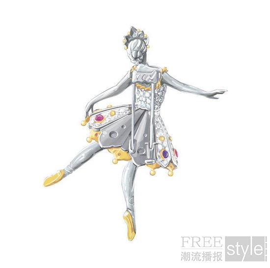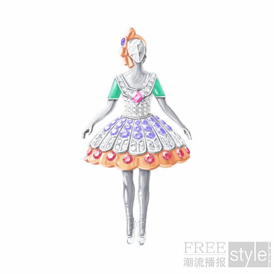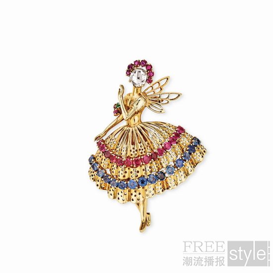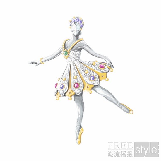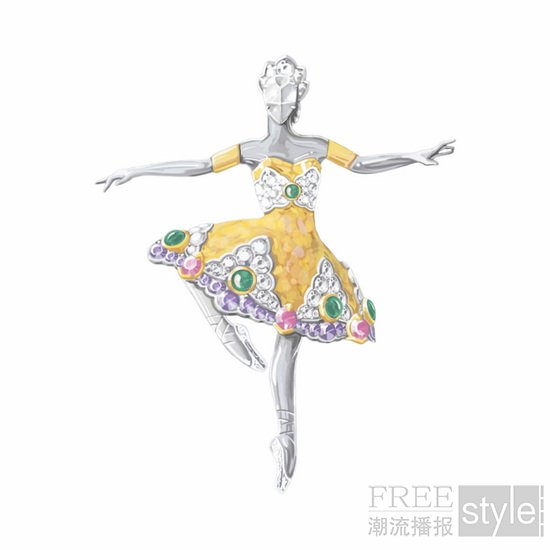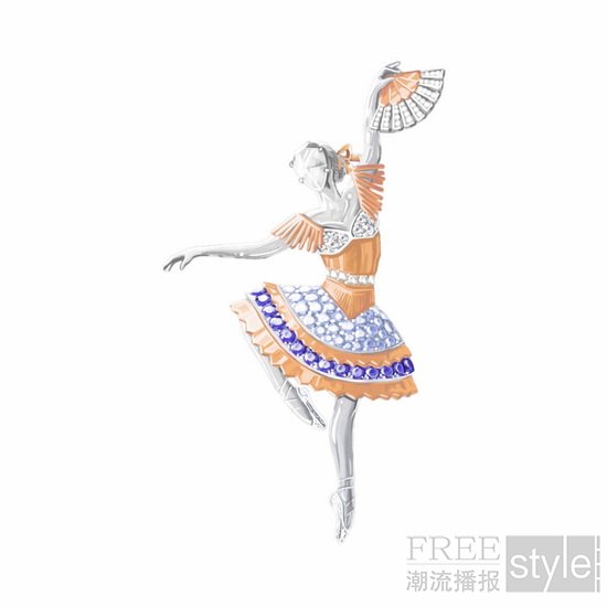 这枚胸针色彩鲜明生动,灵感源自舞伶玛丽‧塔里奥尼(Marie Taglioni)。她曾于1832年在巴黎歌剧院领衔献演由菲利普‧塔里奥尼(Filippo Taglioni)编舞的浪漫芭蕾舞剧《林中仙子》(The Sylph)。作品以珍贵材质重新诠释其服装的标志性元素,呈现镶钻金质翅膀、装饰华丽的紧身胸衣、闪耀的腰带及通体密镶宝石的宽大裙摆。此外,芭蕾舞伶的姿态亦呼应女主角空中动作的轻盈舞姿。