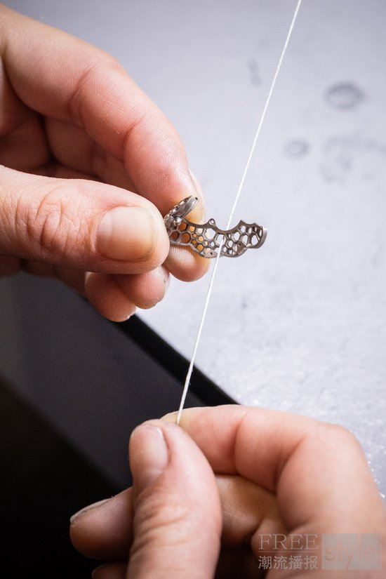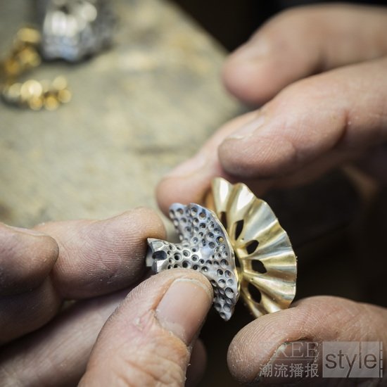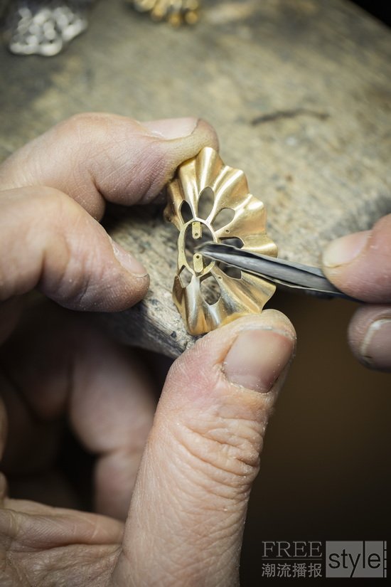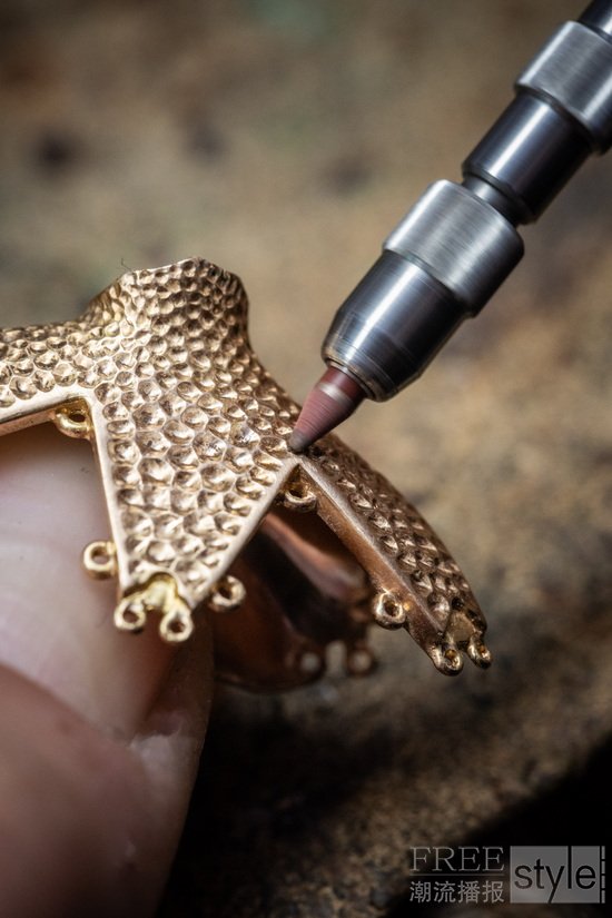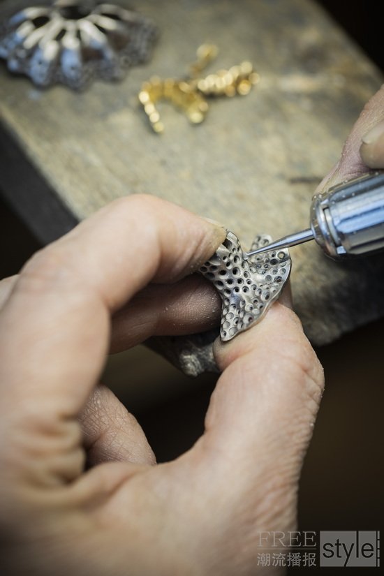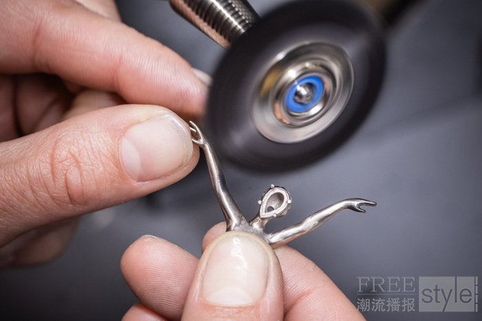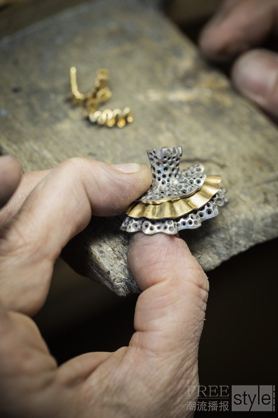 Van Cleef & Arpels梵克雅宝荟萃其精湛工艺,淬炼出炫目动人的舞姿,并秉持精益求精的匠心,严格甄选品质宝石。世家工匠施展专业技艺,先以绿蜡细意打造,这道工序对勾勒芭蕾舞伶的婀娜身姿至关重要,以便珠宝工匠从立体造型研究舞者的形态。工匠仔细观察芭蕾舞者的律动身姿后,运用精湛的蜡模雕塑技艺,重现舞伶的优美姿态和舞裙面料的细腻纹理。待蜡模塑形后,工匠将蜡模熔化,再运用金质手工润饰和抛光,并镶嵌精挑细选的珍贵宝石,为曼妙身影增添流光溢彩。