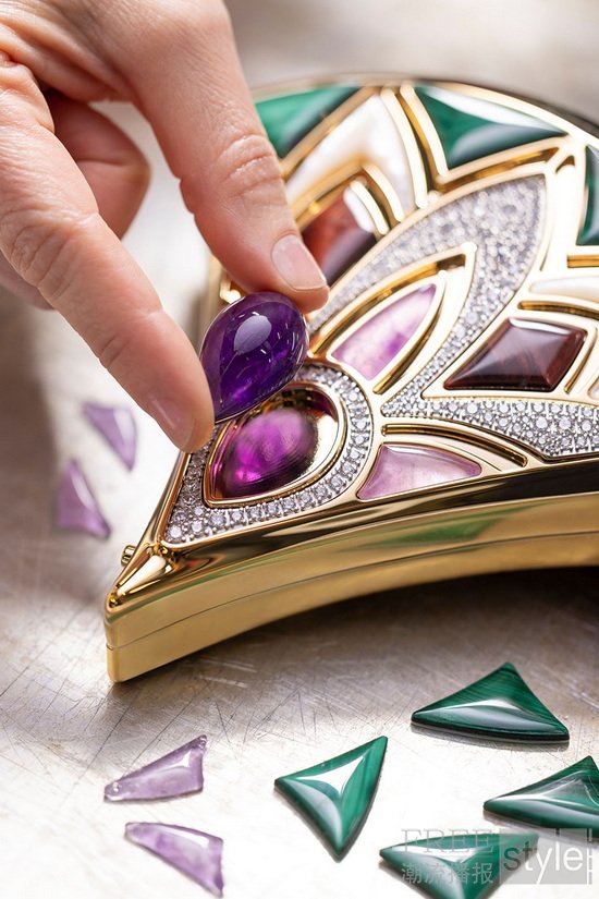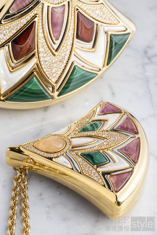 值得一提的是,宝格丽将高级珠宝制作工艺引入到了配饰之中——采用失蜡工艺,精准雕琢出富有雕塑感的立体造型,并融合手工珐琅、手工镶贴与密镶技法,将紫水晶、虎眼石、珍珠母贝及孔雀石等彩色宝石巧妙嵌饰于包袋之上。此外,每件作品均配有呼应其灵感本源的精致链条,且在搭扣处镶嵌一颗凸形蛋面切割宝石,将实用包袋化作可随身携带的艺术作品。