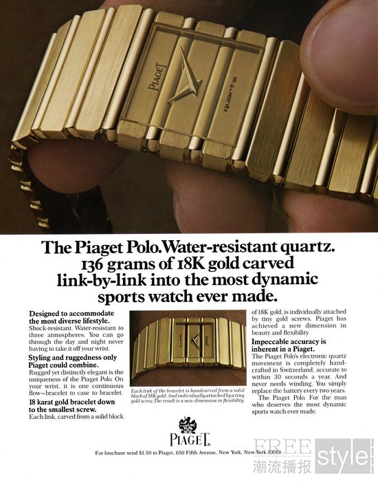 对PIAGET伯爵而言,黄金始终是激发无限创意与灵感的源泉。1969年,PIAGET伯爵瞩目发布“21世纪系列”,其中包括多款风格前卫的黄金珠宝时计。无论是工艺精湛的手镯腕表,还是摇曳生姿的坠饰时计,无不精妙诠释了PIAGET伯爵在制表与高级珠宝领域的深厚造诣。黄金始终是PIAGET伯爵的灵魂所在。这种珍贵材质在品牌位于日内瓦的铸金工坊中悉心熔铸,成为腕表与珠宝创作中展现匠心巧思的载体。1970 年代,瑞士制表界顶尖品牌相继推出多款优雅运动风格腕表,大多为精钢表款。其中,PIAGET伯爵Polo系列腕表堪称独树一帜,以全金材质打造而成,将优雅气质与运动风范完美融于一身,尽显卓尔不凡的独特魅力。彼时,热衷于参加马球比赛的伊夫·伯爵(Yves Piaget)先生将他对马术和高雅生活的热情充分倾注于时计创作之中,使PIAGET伯爵Polo系列腕表成为了1980 年代的魅力标志。无论是在纽约的棕榈滩马球俱乐部还是Chez Régine俱乐部,总是能窥见这款腕表的优雅身影。正如他常说的,PIAGET伯爵Polo系列腕表“既是手镯腕表,也是腕表手镯”。