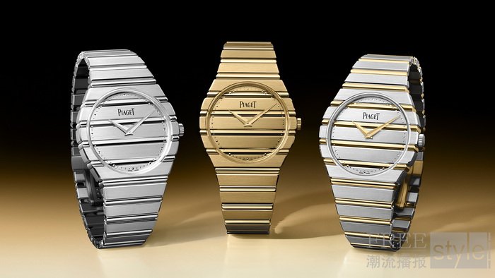 从左至右:PIAGET伯爵Polo 79腕表白金款、黄金款与双金款