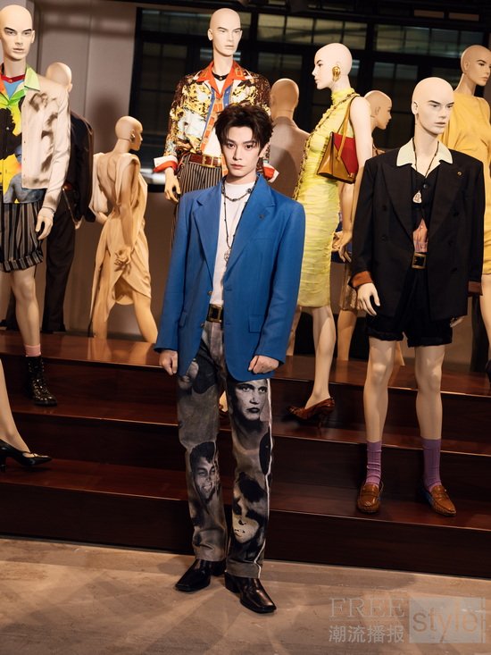 【上海,1月28日】全球品牌代言人丁禹兮身着蓝色羊毛亚麻混纺单排扣正装夹克,饰以Medusa胸针,搭配印花牛仔裤,内搭白色棉质背心,并配以黑色皮质腰带及黑色石纹项链,自带摩登矜贵风姿。