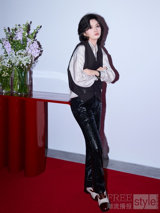品牌挚友春夏身着深巧克力色羊毛马海毛混纺正装马甲,内搭真丝细条纹长袖衬衫与白色棉质V领背心,搭配黑色直筒皮质长裤、棕色皮鞋,并配以黑色皮质腰带及蓝色麂皮Pivot手袋,诠释随性自在的精致格调。