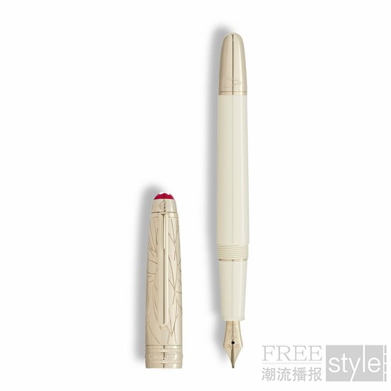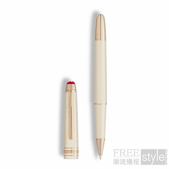 万宝龙大班系列朱丽叶特别款双色书写工具将奶白色名贵树脂笔杆与精雕羽毛纹饰的镀香槟金笔帽巧妙融合,进一步升华朱丽叶天使般空灵圣洁的气质。书写工具搭配经典镀香槟金饰件;笔帽顶端的六角白星品牌标识嵌于红色名贵树脂中,周围环饰玫瑰花刺纹样;手工打磨的18K镀香槟金笔咀镌刻爱心和“Juliet”字样,细节之处尽显匠心。