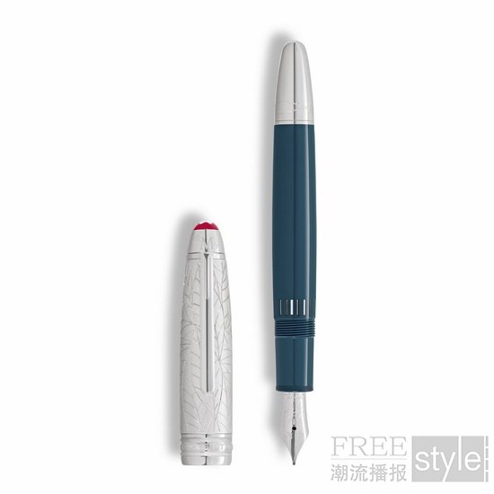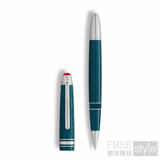 这款大班系列贵金属豪华墨水笔将罗密欧与朱丽叶特别款的主题设计细节融于一体,象征两位恋人情感世界的交汇合一。笔帽和笔杆涂覆青绿色渐变漆料,以经典镀香槟金细腻勾勒叶片轮廓,令人联想到凯普莱特花园的葱茏绿意。笔帽顶端的六角白星品牌标识嵌于红色名贵树脂中,交织镌刻的字母“C”和“M”代表两个家族的世仇纷争,赋予这对恋人命运的传奇底色,而蜿蜒延伸的玫瑰花刺图案装饰于笔帽顶端与笔杆尾端,更添一抹深情宿命之感。饰有“R + J”字样的18K金笔咀,致敬这段勇于冲破命运阻碍的永恒爱情。