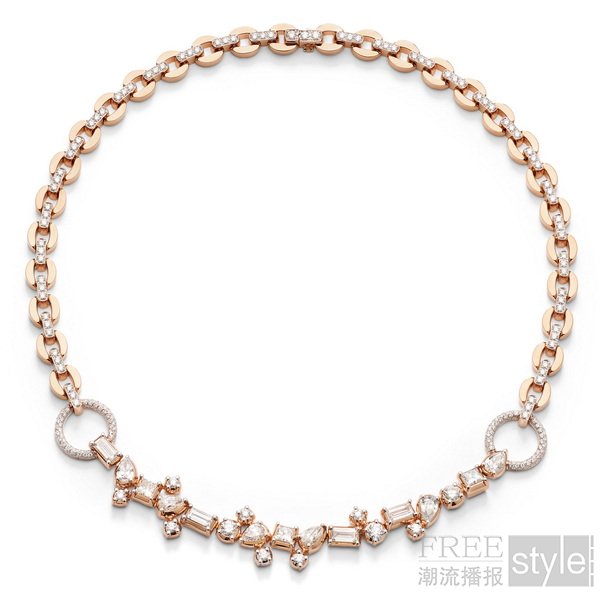 这款颇具雕塑美感的玫瑰金项链,从Pomellato宝曼兰朵1970年代风格鲜明的圆环链节设计汲取灵感,焕新演绎典藏佳作。266颗明亮式切割钻石沿链节上缘呈线状排列,宛如高级定制时装上的珍贵丝线,精准勾勒出项链的精致轮廓,为整体造型镀上一层柔和却清晰的璀璨光泽。项链中央以13颗花式切割钻石构成视觉焦点,这些梨形切割、公主方形切割及长阶梯形切割钻石从镶钻圆环中延伸而出,绽放夺目光彩。圆润饱满的密镶钻石圆环与几何线条利落的花式切割钻石形成鲜明对比,在光影流转间跃动着打破规则的迷人韵律。
