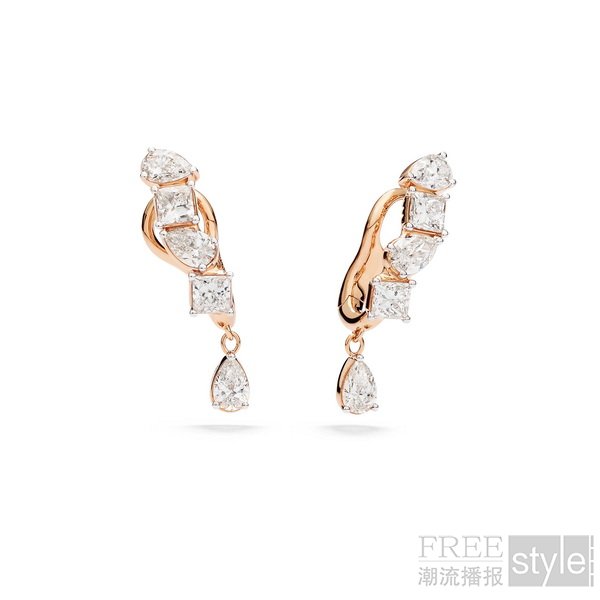 这对玫瑰金耳环以非对称方式镶嵌公主方形切割与梨形切割钻石,整体设计精巧别致、立体感十足。尤为引人注目的是,每只耳环均缀有一颗灵动的梨形切割钻石坠饰,随佩戴者举手投足摇曳生姿,轻揽流光。精巧坠饰与耳环雕塑般的造型相映成趣,恰如其分地诠释了本系列的核心精髓:建筑般的几何结构与流动韵律之间达成精妙平衡。