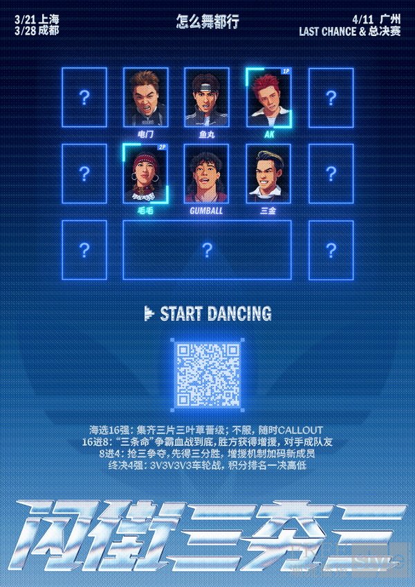 赛事将于成都、上海、广州三座城市陆续展开,并最终在广州迎来全国总决赛。作为品牌在街头文化领域的又一次深度实践,「闪街三夯三」从街头的即兴逻辑出发,打破固定队伍与单一舞台的限制,将选择权重新交还给舞者,让比赛像街头一样始终处于流动之中,还原舞者之间真实的链接与表达。在赛制设计上,「闪街三夯三」以三人制为基础,引入动态组队与多重博弈机制。舞者需通过现场争夺完成组队,并在比赛进程中不断面对阵容变化与策略调整。包括“三条命”机制、增援机制、CALL OUT 抢位以及终局乱斗在内的规则设计,使赛事不再只是技巧比拼,而成为团队判断、协作与应变能力的综合较量。赛事将从个人对抗逐步升级为团队战斗,并在决赛阶段演化为多队同场的终极乱斗。每一次出场,都不仅关乎胜负结果,更关乎舞者是否愿意持续站上舞台、回应音乐、继续表达。