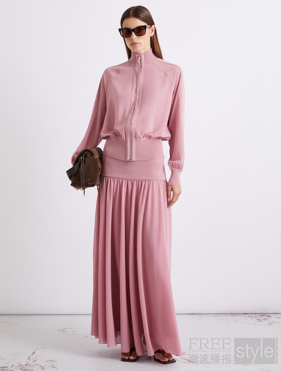 跳出甜蜜幻象,这一季的粉是低饱和的、清醒的。粉可以是柔的,也可以是韧的;是衬衫与半身裙上那抹细腻真丝的光泽,是针织衫里金银丝线隐约的闪烁。立领外套温婉中藏着一份大气,圆领衫在光泽中透出轻松的精致。本季,不同层次的粉调,是对自己温柔的确认。