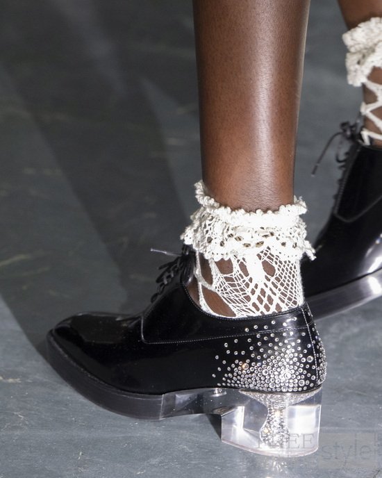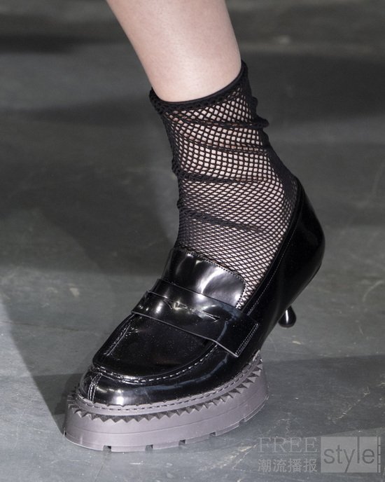 鞋履设计均在绅士鞋原型之上展开对性别符码的探索,以系带牛津鞋和乐福鞋为基底,并全部采用抛光黑色小牛皮革制作,再经由两个品牌的独特视角重新诠释。STAR 鞋款以极致经典的尖头牛津鞋为原型,镶有朋克风格的五角钢星。这颗星既是 Jimmy Choo 的标志性元素,也是 noir kei ninomiya 2026 春夏系列中贯穿始终的服装设计结构图案,在此则化作鞋头与沿条皮革鞋底上的璀璨点缀。而鞋身铺满星芒铆钉点缀的 STAR 鞋款将在部分精选旗舰店独家发售。MAXI LOAFER 鞋款将传统男士乐福鞋的鞍形带、莫卡辛缝线鞋头及突出的鞋底结构,与 Jimmy Choo 标志性的精巧滴跟融为一体,在一件单品中同时展现脆弱与力量。压轴亮相的 CRYSTAL鞋款则将前两款鞋型的特点融合,男士牛津鞋的鞋跟以透明树脂进行透视重构,其中包裹并展示着镶满细密水晶的经典水滴跟,珍贵细节在透明方跟中若隐若现。水晶仿佛从中漫溢而出,点缀着锋利的皮革鞋后帮,形成细腻与力量的二元交融。同时乐福鞋的轮廓亦经重新设计并抬高,以容纳这一独特鞋跟,再次实现对立元素的融合。