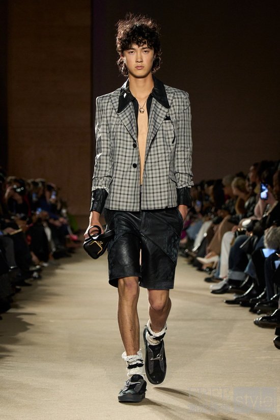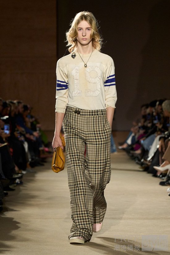 本季外套设计的核心亮点聚焦在校队夹克,其材质以纯皮革、皮革拼接羊毛呈现,并首次推出全剪羊毛款。并叠搭70年代风格的修身短款夹克,其短腰长袖的设计加强了对比例的把控。除此之外,外套系列还加入了多款经典外套,如短外套、剪羊毛和麂皮大衣,其中部分款式用以仿皮草领口点缀,延续复古气息。