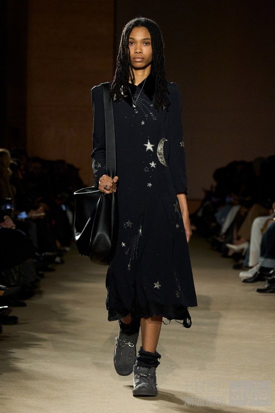 2026 秋季系列以触感丰富的皮革与剪羊毛夹克、精裁羊毛西装以及再造丹宁长裤为特色。整体廓形融合了1940年代的剪裁结构与70年代的运动风格元素,羊毛与丹宁材质的喇叭裤、A字裙,搭配干净利落的西装外套(其中部分外套采用反穿设计,展露内衬细节),赋予造型更具层次的表达。一组裙摆及地的高领长袖连衣裙,将高级时装的经典比例与带着反叛风格的磨损感相结合,在优雅与不羁之间寻找平衡。与此同时,Coach也重新回归“盛装打扮”的乐趣,推出灵感源自30至40年代,具有好莱坞风格的晚装系列,收腰廓形与垫肩设计勾勒出鲜明线条,并以镂空剪裁与闪耀贴饰点缀,呈现复古与现代交织的张力。