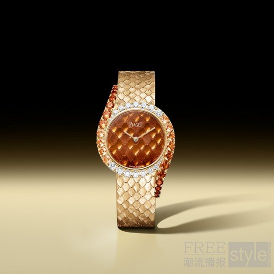 2026年春季,PIAGET伯爵焕新演绎Limelight Gala系列腕表,倾情呈献两款全新杰作。其中一款腕表洋溢无尽活力,以炽热如焰的色调点亮视觉盛宴。表盘采用炽烈明艳的橙色大明火珐琅,覆于精细雕琢的蛇鳞纹黄金基底之上,纹理灵动。璀璨钻石环绕圆形表圈,层层密镶,如星河倾泻,顺势延展而出,蜿蜒流转间渐次融入深邃浓郁的锰铝榴石——其色泽宛若熔金落日。整枚腕表搭载同样饰以蛇鳞雕刻工艺的黄金表链,鳞片错落有致,触感柔韧贴合,尽显优雅不羁的奢华风范。这一精妙绝伦的黄金雕刻工艺,首次亮相于2019年PIAGET伯爵Extremely Lady系列腕表。它对技艺的精湛程度与专业水准有着近乎苛刻的要求,镌刻下对“金工世家”一丝不苟的工匠精神的礼赞颂歌。通过错视艺术(trompe-l’œil)的巧妙运用,表盘呈现出令人惊叹的立体层次与细腻肌理,仿若真实蛇鳞蜿蜒起伏,光影流转间栩栩如生。
