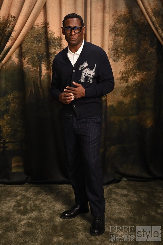 英国演员David Harewood(大卫·海伍德)身着dunhill 2026春夏系列LOOK 27,深海军蓝羊绒亚麻Terrier开衫及羊毛法兰绒条纹长裤,出席在伦敦举办的British Vogue & GQ致敬时尚与电影派对。