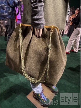 配饰则为系列注入点睛之笔:经典Pasticcino甜点包采用皮革或麂皮材质,经特殊处理重现标志性的混纺质感,亦有不同尺寸的天鹅绒版本;天鹅绒晚装拖鞋、搭扣靴、源自徒步灵感的功能性短靴、软呢帽、长款羊绒手套与印花丝巾等单品,层层叠搭,旨在丰富造型的层次与质感。