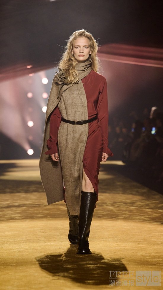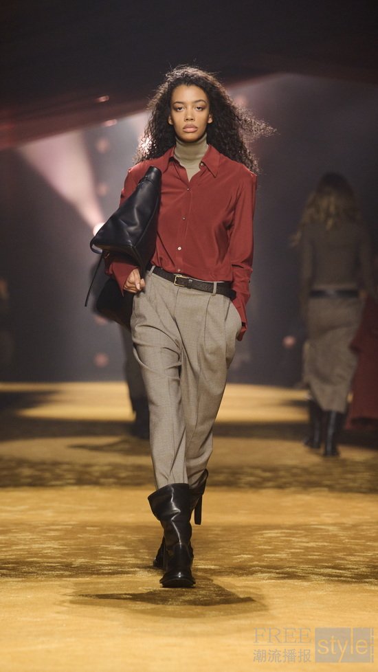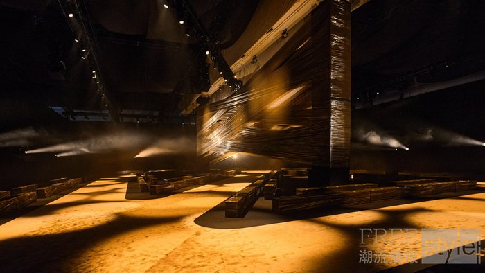 秀场空间呼应本季高阶美学格调,致敬系列背后的匠心工艺。米兰Rubattino56场地化身建筑美学空间,为成功着装而生。饰带面料纵横延展于场地内,定格于可控的张力状态;秀场地毯纹理与色调的灵感则源自系列中赭色压绒面料。