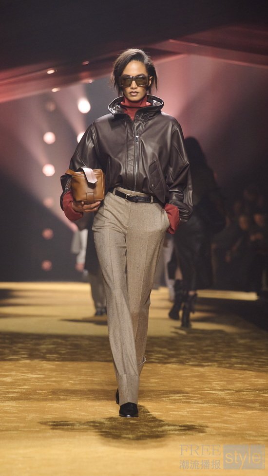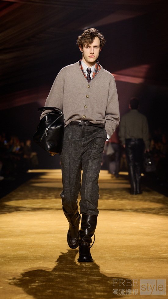 ”我们的核心目标之一,是将精裁西装置于更偏向生活方式的语境中,跳出传统职场着装的框架,使其适配多元混搭场景。作为这一设计思路的例证,我们将部分西装搭配马术风格靴款呈现,靴型灵感源自品牌典藏的男士乐福鞋。质感以及创制新颖效果的面料加工艺术是本季关键所在。皮革作为近几季BOSS衣橱的标志性材质,此次更是核心亮点。通过对该材质的试验探索,令其以不同形态遍布全系列,诸如质地坚实却触感柔软的皮革、鸵鸟皮肌理、马毛皮肌理,不一而足。针织品亦开辟全新方向,以独特针织工艺赋予凌厉质感,呼应贯穿本系列大胆张扬的设计格调。色系选择旨在最大化呈现面料质感,包括墨黑、午夜蓝、烟灰、橄榄绿与深棕、暖陶土以及金赭色,我们希望传递出一种振奋人心的视角:精致、升华、积极,尽显BOSS式自信。”Falcioni表示。
