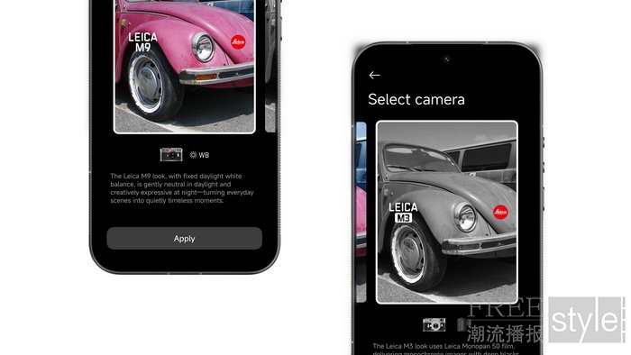 Leitzphone的UI/UX界面由徕卡主导设计。从主屏幕、小组件到相机菜单,均采用清晰简洁的视觉语言,始终以用户的创作需求为核心。相机内置13款徕卡专属画质、5种散景模拟功能,以及多个摄影主题小组件。此外,“徕卡一瞬”对经典徕卡影像风格进行了数字化重塑,其中包括受徕卡M9启发的色彩呈现和源自徕卡Monopan胶片的黑白配置文件。