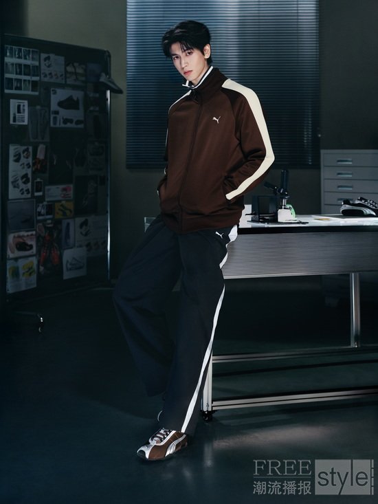 视觉核心聚焦于由张凌赫亲手“唤醒”的H-Street OG低帮薄底鞋。该鞋款致敬蕴藏于PUMA ARCHIVE中历久弥新的径赛传奇,深棕色轻量化网面与经典T形鞋头,动势轮廓呼之欲出;银色流线型条纹拼接其间,在极简层次中闪烁工业质感与怀旧温度。在服装搭配上,张凌赫身着棕色针织外套与黑色梭织长裤,将PUMA T7系列标志性的7cm至2cm跑道条纹横贯在侧,尽显PUMA先锋能量。