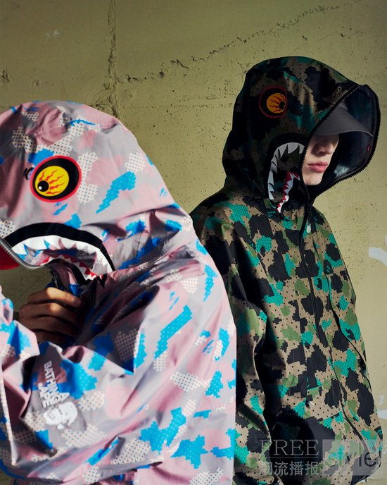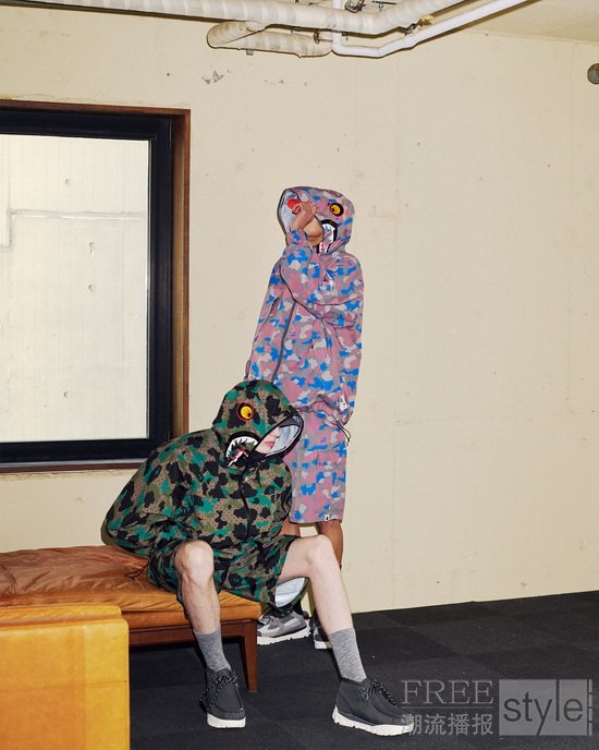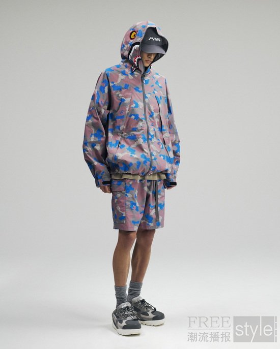 中层叠穿单品、衬衫与印花服饰,共同构筑了本系列的风格精髓与叙事概念。核心单品包括DIGITAL COLOR CAMO长袖衬衫、DIGITAL 1ST CAMO DOT短袖以及美式复古鲨鱼帽衫,后者通过重新演绎的BAPE®经典图案诠释本季主题。系列以功能性抓绒面料重塑BAPE®标志性单品,同时推出更多搭载可拆卸设计、模块化配件与轻量化结构的款式,实现都市与自然场景间的自由切换。