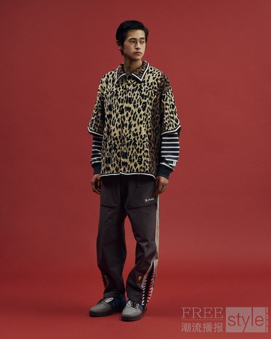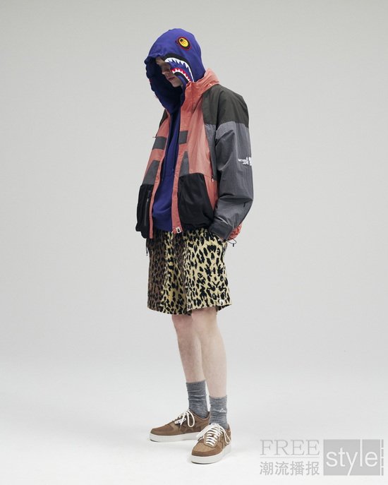 外套系列以三层轻量科技面料为核心,其中引领风潮的焦点单品为搭载DIGITAL CAMO DOT满幅迷彩的三层滑雪鲨鱼夹克,将标志性迷彩元素与轻松便携的实用机能融为一体。同样采用三层复合面料的另一款滑雪夹克则通过BAPE®经典鲨鱼图案强化流线型廓形;三层连帽雨衣配备可灵活拆卸的兜帽设计,实现一衣多穿的功能属性。最后的压轴之作是 ALPHA高性能硬壳夹克,具备优异透气性能与简洁剪裁结构,助力从容抵御变幻莫测的气温变化。