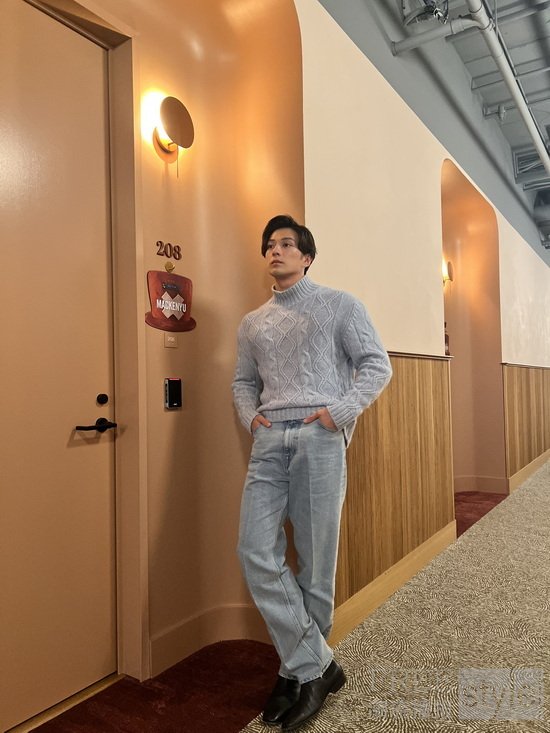 日本演员Mackenyu(真剑佑)身着dunhill 2026早春系列:浅色丹宁羊绒混亚麻高领针织衫及浅靛蓝色丹宁长裤,出席在Netflix的《海贼王》(One Piece)宣传行程。