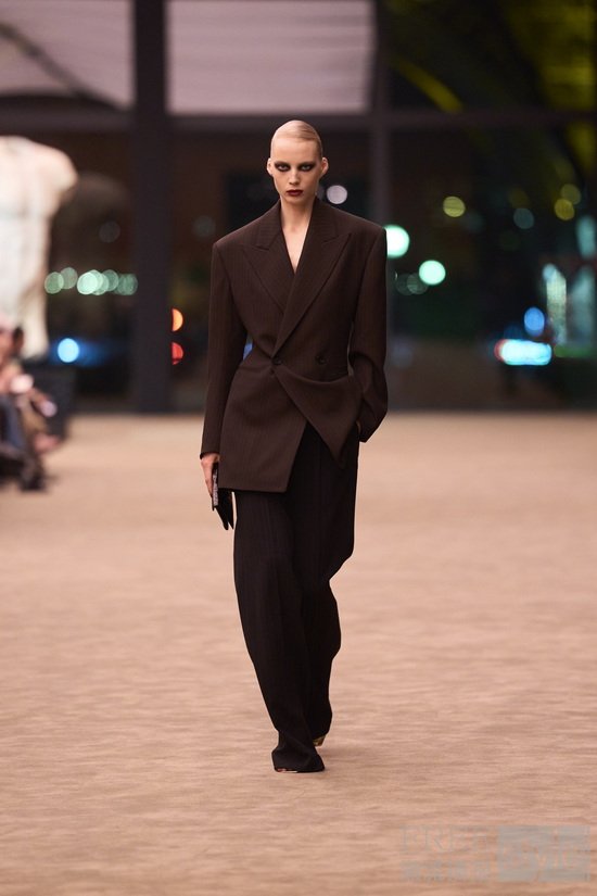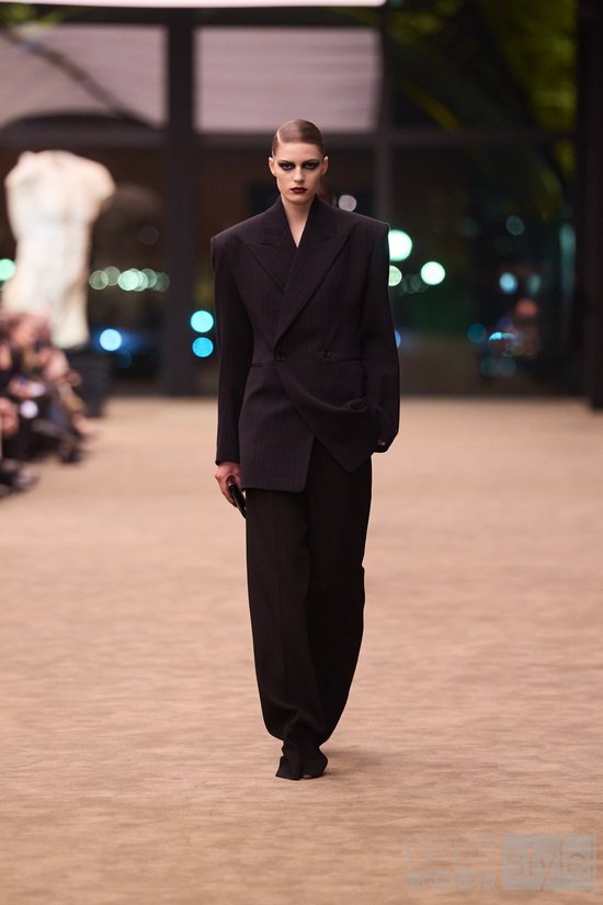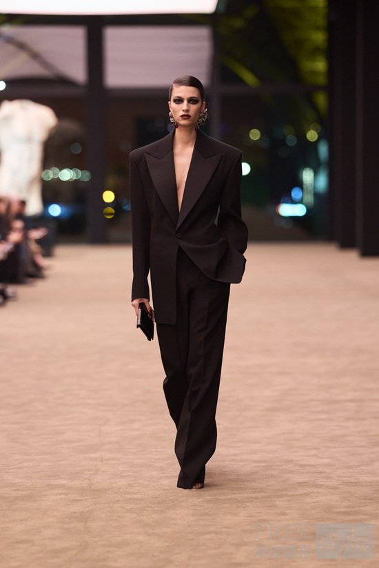 精妙剪裁,成为整场大秀的灵魂。Vaccarello以一系列单排、双排扣黑色西装开篇,遥相呼应上世纪70年代末至80年代初的理性克制感,又凭借情感注入,超脱于权力的符号化表达,于刚柔维度间构建静谧流动的对话。锋芒毕露的斜肩线条渐次收窄至柔韧腰身的廓形贯穿整个系列,赋予女士西装舒展的松弛与自由气息。若说这是Vaccarello为整场大秀定下的基调,那么他的终章则将品牌经典吸烟装革新重塑,以更慵懒不羁的姿态诠释其暗夜风华。