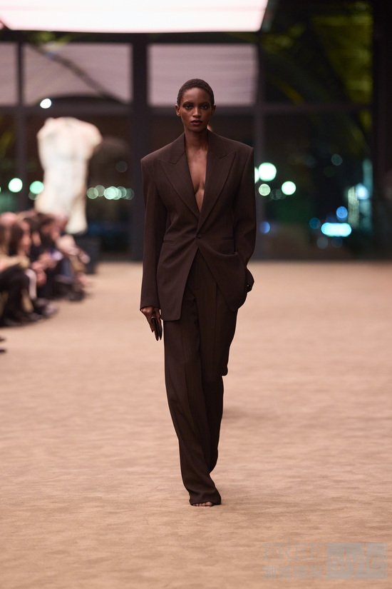 为烘托电影氛围感,Vaccarello打造现代主义极简场景:通透的玻璃、木质与皮革构筑的私密寓所,线条流畅,如梦似幻,无源可寻。巨型复刻雕像伫立秀场中央——原作曾陈列于伊夫·圣罗兰(Yves Saint Laurent)先生私宅。透过玻璃幕墙,埃菲尔铁塔隐约可见,仿佛时刻提醒着观众:巴黎,才是SAINT LAURENT圣罗兰永恒的故乡。