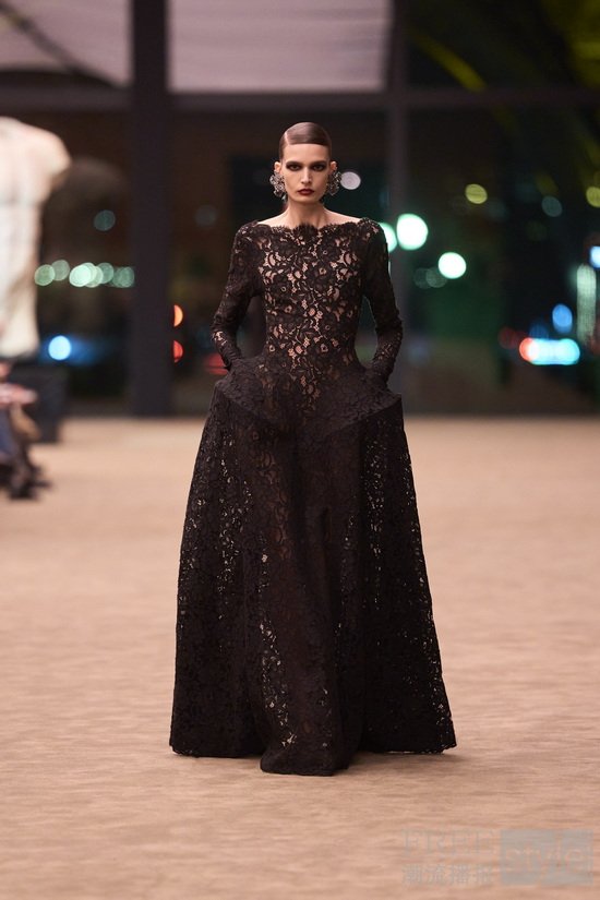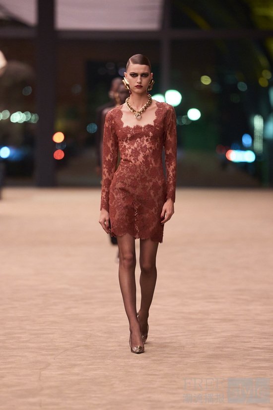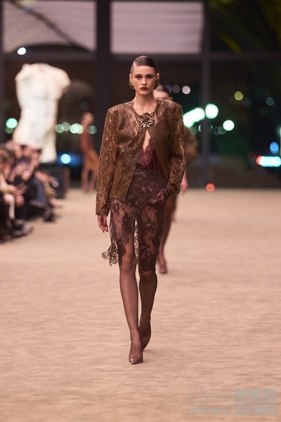 由此,Vaccarello聚焦亲密感与脆弱性的美学表达,礼赞私密情感而非浮夸空洞的视觉堆砌。晚装部分大胆运用硅涂层 轻薄蕾丝:蕾丝宛如精裁面料般挺括有型,西装则流淌着柔软灵动的魅力——传统范式在此反转,脆弱蜕变为力量,型格之间展露风情。羊剪绒外套柔软宽松,束带于臀部,垂坠设计带来包裹全身般的庇护与舒适感,着重传递丰富的触感体验。精裁单品以纯正黑色为底,其他穿搭造型则染上油画般色彩,从赭石、青绿、法蓝渐次过渡到深棕色调,最终由雕塑感十足的金色鸽形珠宝点亮。