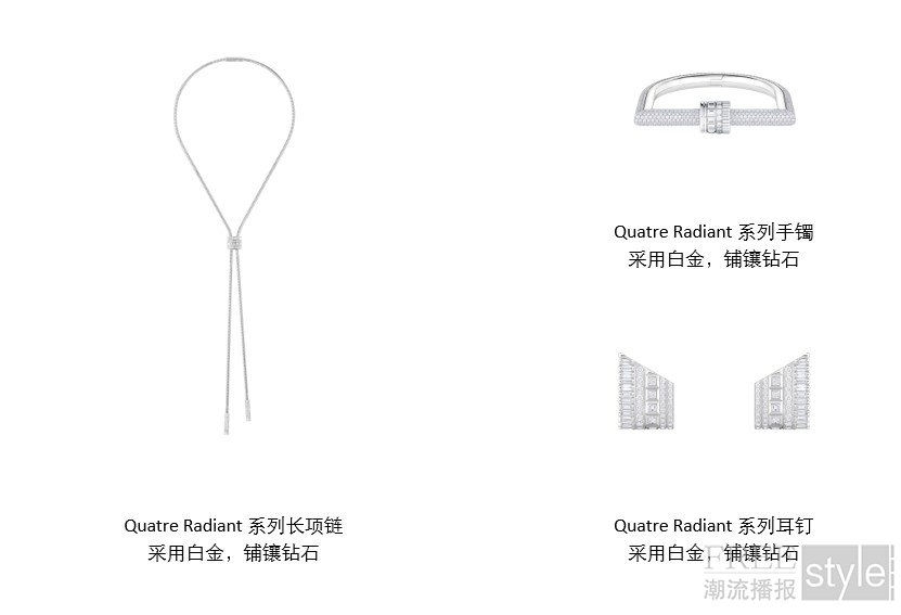 世家呈献Quatre Radiant系列新作,以白金单色调结合璀璨钻石演绎纯粹美学。耳钉与长项链以不同钻石切割工艺,焕新演绎系列四大经典饰纹:以圆形明亮式切割钻石呈现双圈同心圆和钻石圈,以长阶梯型切割钻石刻画罗缎直线刻纹,巴黎饰纹则由公主方形切割钻石勾勒而成。2025年以Quatre系列经典配色首度亮相的Tube手镯,此次亦焕新推出全白金镶钻款。
