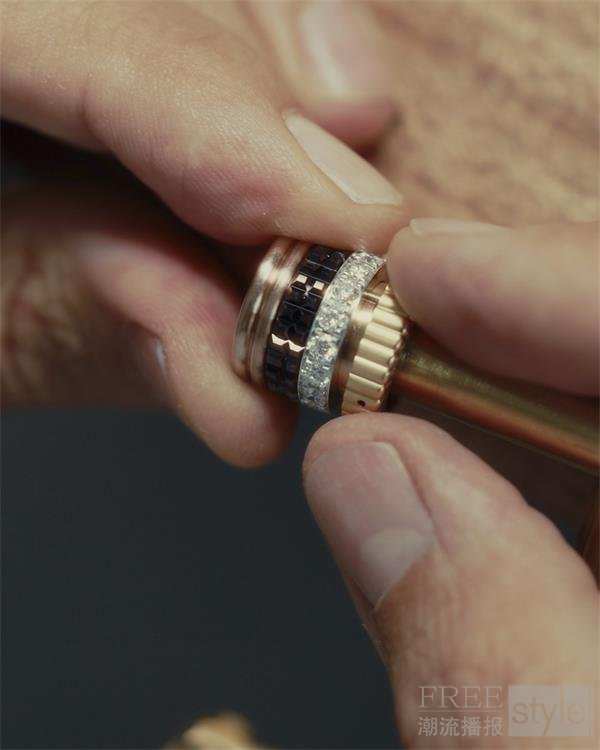 自合金淬炼之初,直至四圈圆环的最终拼接,每一道工序皆达到近纳米级的精度,因为任何细微偏差,都可能影响最终成品的完美呈现。四圈圆环完全经由手工压合而成,而非胶水粘连或焊合。当最后的闭合声轻响,即为这件作品完美落成之时。