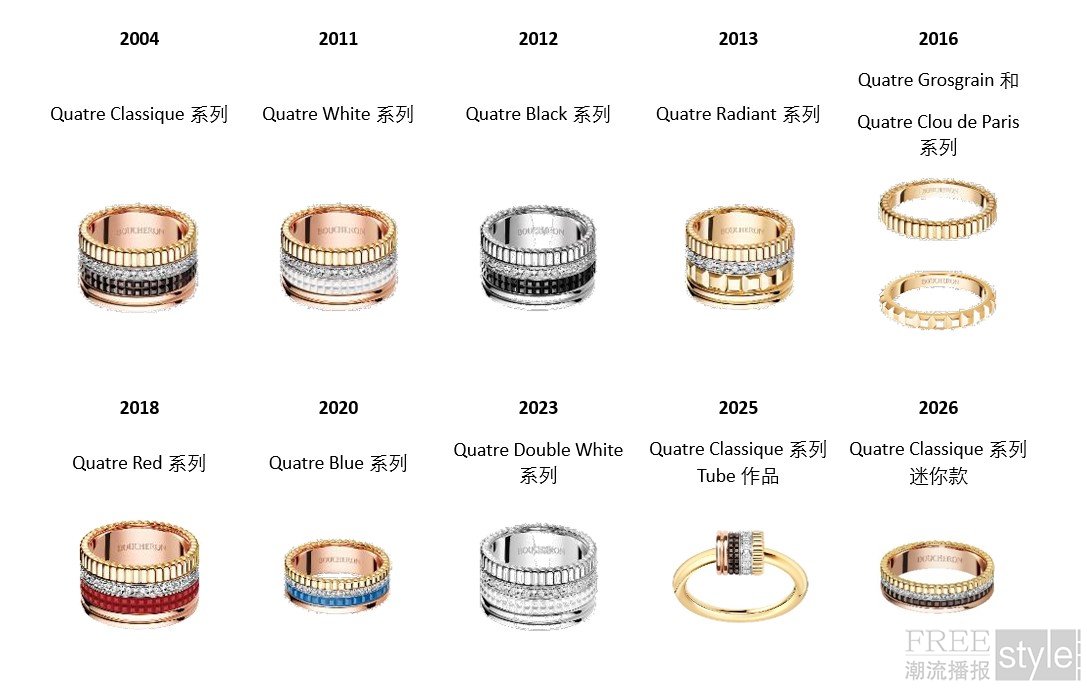 2026年,Boucheron宝诗龙推出Quatre迷你款戒指,再度焕新演绎世家标志Quatre系列。为庆祝新品发布,宝诗龙品牌代言人Daisy Edgar-Jones、韩韶禧,及演员Dilan Çiçek Deniz共同出镜演绎全新全球广告大片“Quatre is getting mini”。世家更将Quatre系列的作品版图进一步拓展,呈献多款专为“自由饰我”而打造的全新之作,鼓励佩戴者多层次叠戴、随性混搭、大胆组合。