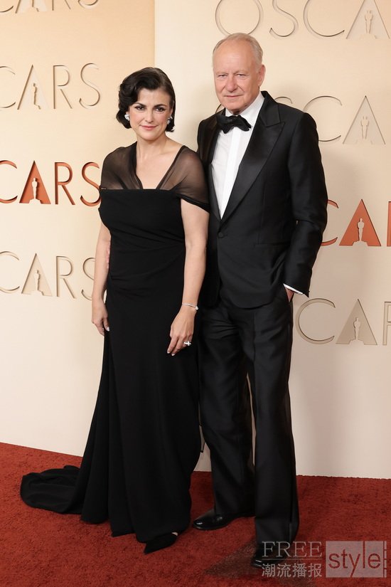 斯特兰·斯卡斯加德(Stellan Skarsgård)身着杰尼亚2026红毯系列黑色羊毛枪驳领礼服、黑色阔腿长裤、白色府绸包扣衬衫、黑色丝绸领结、及黑色手工抛光皮革Gala套穿便鞋亮相第九十八届奥斯卡金像奖红毯。