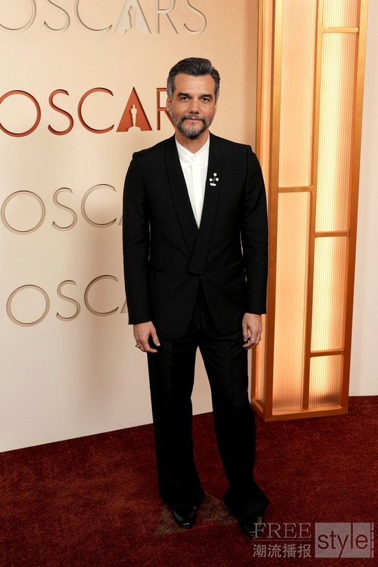 瓦格纳·马拉(Wagner Moura)身着杰尼亚红毯系列黑色羊毛开襟式西装夹克、黑色羊毛阔腿长裤、白色桑蚕丝带袢领衬衫、及黑色手工抛光皮革Gala套穿便鞋亮相第九十八届奥斯卡金像奖红毯。