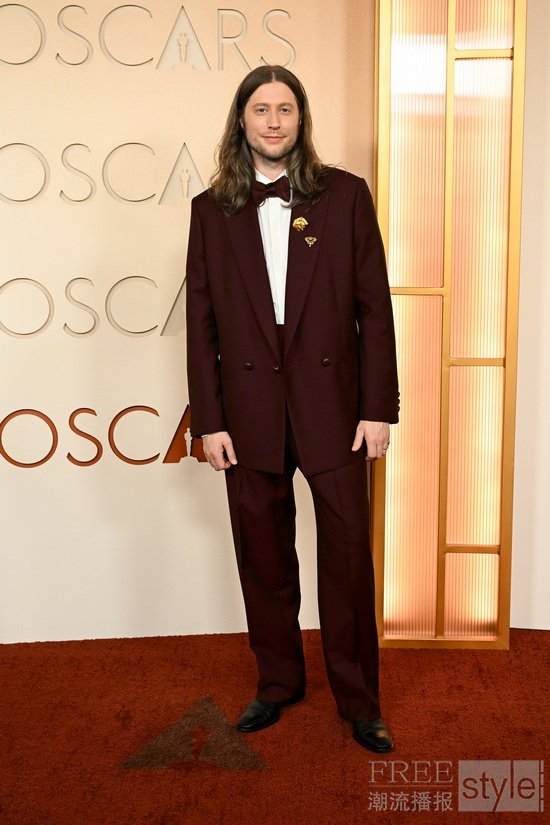 路德维格·戈兰松(Ludwig Göransson)身着杰尼亚2026冬季系列酒红色枪驳领西装夹克、白色桑蚕丝衬衫、酒红色阔腿长裤、酒红色领结、及黑色Corso晚装鞋亮相第九十八届奥斯卡金像奖红毯。