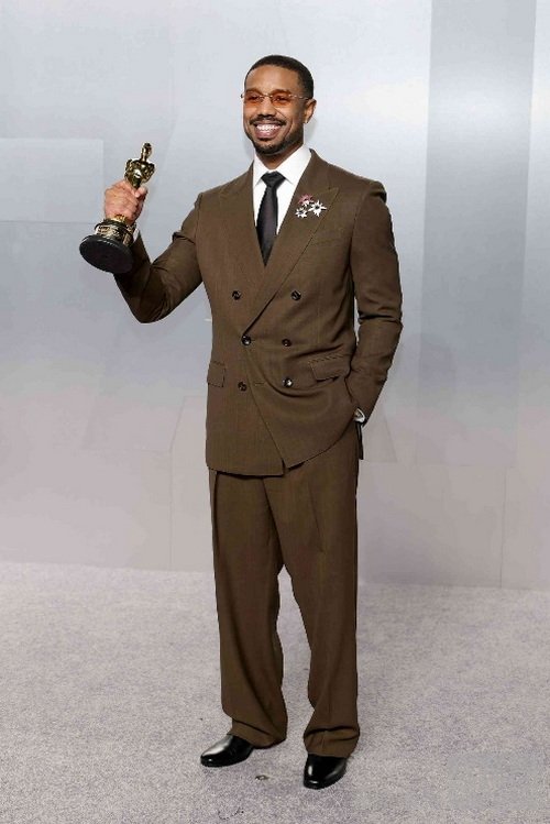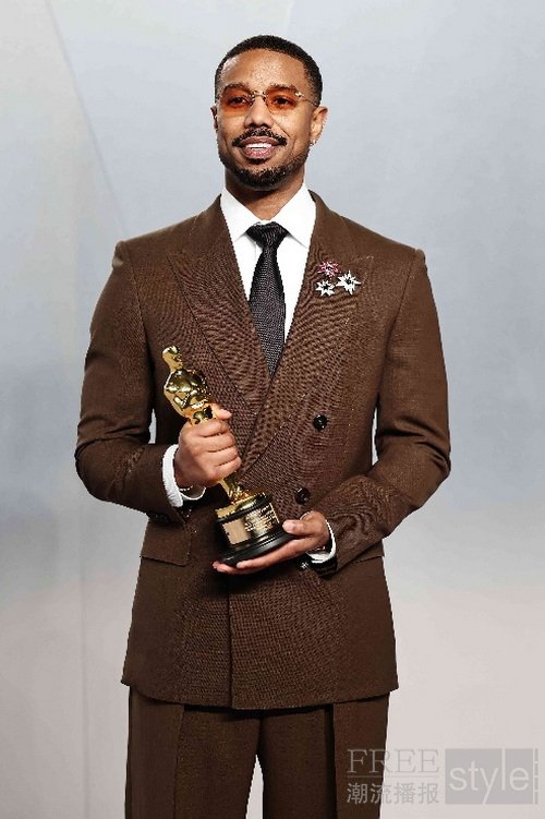 迈克尔身穿棕色双排扣西装,内搭白色衬衫与黑色领带,简约配色与利落剪裁相得益彰,于红毯之上诠释从容自信的绅士格调。