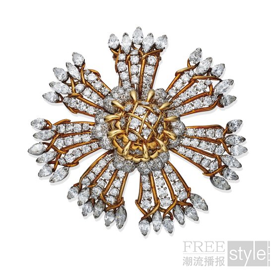 另一件创作于1962-1964年的花簇胸针,以六颗黄钻映衬中央的心形祖母绿,同样呈现出春日花园般的蓬勃活力。这枚胸针曾登上1964年蒂芙尼Blue Book 与《纽约时报》广告,成为品牌历史的重要见证。