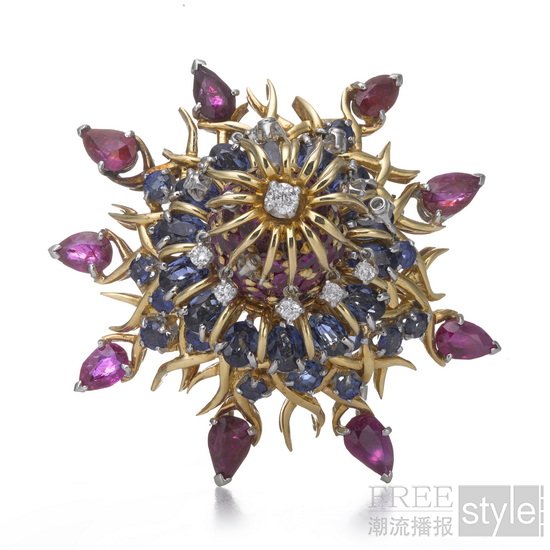 花卉主题在史隆伯杰的创作中有着丰富多样的面貌,其中立体感便是其中鲜明风格之一。在这两枚花卉造型胸针中,他运用标志性的黄金与铂金组合工艺,赋予每件作品充满层次的雕塑质感。1952年的花朵胸针,以中央隆起的黄金框架勾勒花蕊结构,周围花瓣以钻石铺陈,如光芒般向外延展。1964年的胸针则创造性地以红宝石与蓝宝石,捕捉热带风光与海洋景致的灵动魅力,呈现出强烈的色彩张力与生命力。