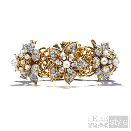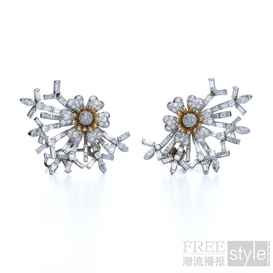 这组手镯与耳夹作品同样展现了史隆伯杰对花卉主题的多重诠释。创作于1959年的花簇耳夹,以多种切割形态的钻石从中央主钻向外延展,宛若光芒流转的花朵在耳畔盛放。而创作于1999年的花簇手镯,则源于史隆伯杰保留的手稿遗珍。六朵钻石花沿依次盛开,形态各异,既再现了史隆伯杰的卓越天赋,也彰显出蒂芙尼对其设计语言的传承与致敬。