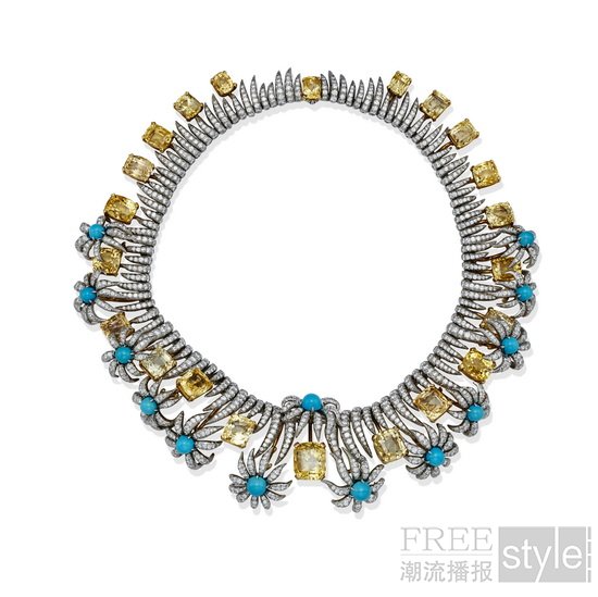 在让·史隆伯杰的创作世界中,植物花卉占据重要地位。在他的敏锐洞察与想象之下,自然生机流转于珍贵金属与宝石打造的花叶枝蔓间,徐徐铺展出一座繁盛灵动的珠宝“花园”。在这座“花园”中,彩色宝石是鲜活生命力的重要表达。创作于1960年的树篱与花列项链,以二十二颗黄色蓝宝石环绕排布,其间点缀十三颗绿松石,色彩明丽且富有节奏感,是史隆伯杰最具代表性的作品之一。